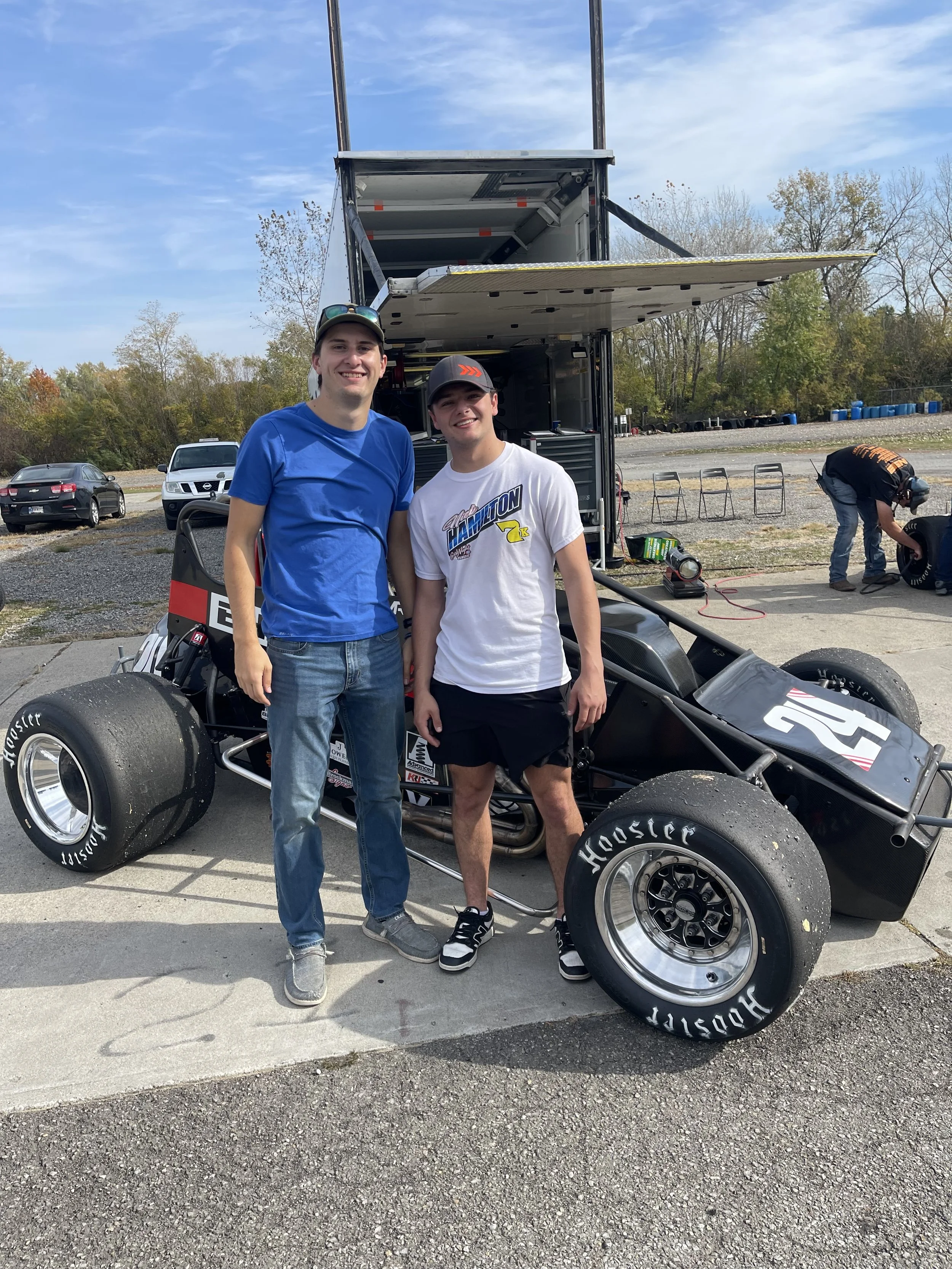 Ryan Huggler pictured with Jackson Macenko after testing a sprint car at Anderson Speedway.